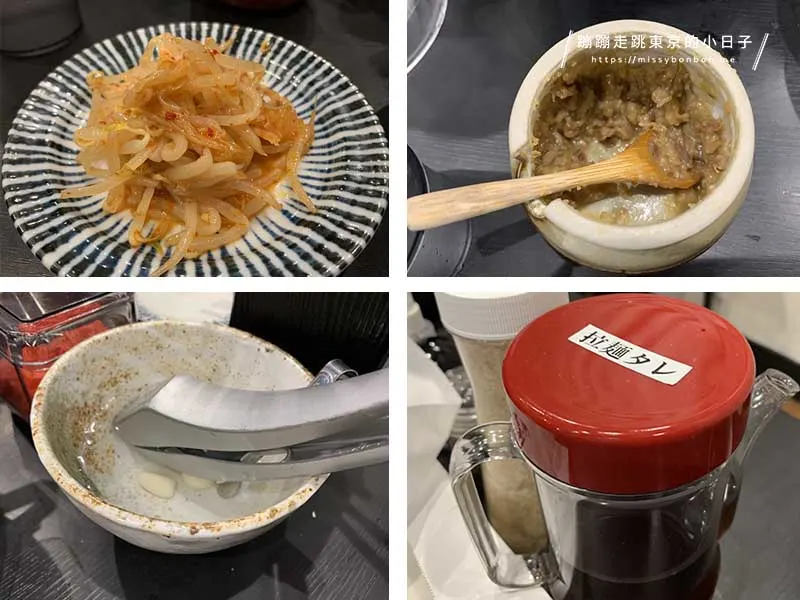 桌上提供的辛高菜、蒜蓉、拉麵醬與生大蒜可自行添加,我稍微加了一點蒜蓉與辛高菜,湯頭的鮮味更被襯托出來。