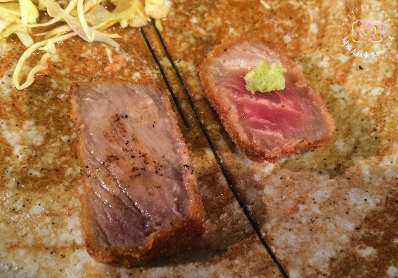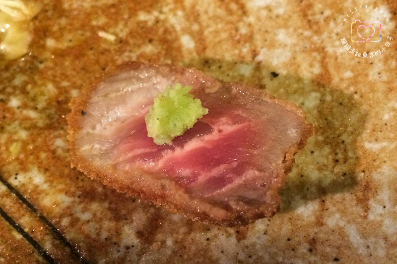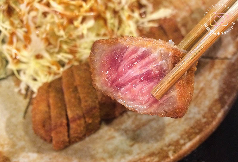剛炸好的牛かつ,內裡還帶著淡淡的粉紅色,一看就知道肉質極其鮮嫩。第一口直接品嘗原味,外層酥脆香濃,內裡卻保有類似生魚片的滑嫩口感,牛肉的鮮甜在口中蔓延,讓我瞬間驚呼:「這真的不是生魚片嗎?!」