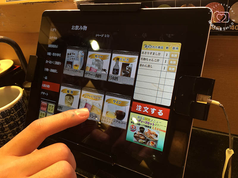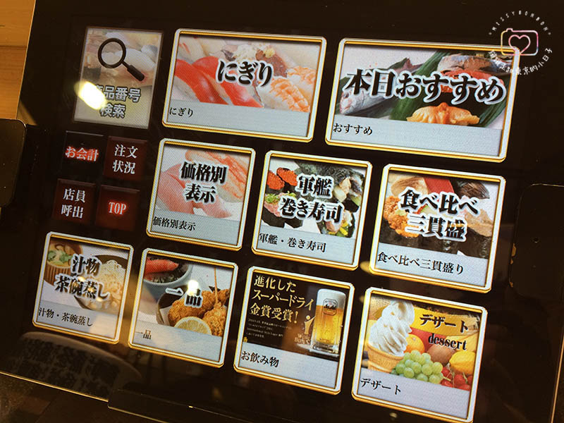 平板上的選單功能很多且非常清楚,就算不會日文也能透過圖片與漢字辨別。除了點餐之外,也可以呼叫店員、吃一半想知道總共點了哪些餐點了,也能透過平板查詢,最後要結帳時也能使用平板呼叫。