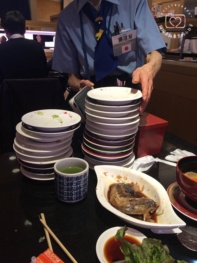 當你吃得差不多時,只需按下呼叫鈴,服務生便會前來。他們會使用一台掃描器掃描所有的盤子,迅速完成結帳過程。