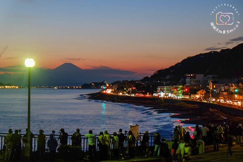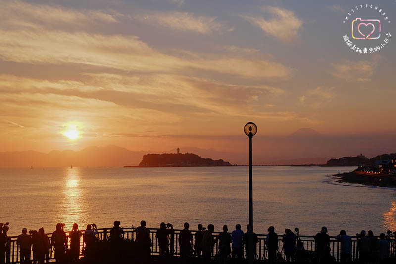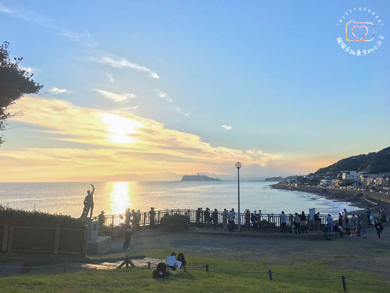實地親眼所見,的確真的非常美,而且如果天氣好、並且空氣夠清澈時,從稲村ガ崎海浜公園能看到江之島+夕陽+富士山三景在同一個畫面中出現! 而且今天這邊好多攝影師早早架好了攝影腳架,固定好了他們的大砲鏡頭!等待著今晚的重頭戲-花大大會。