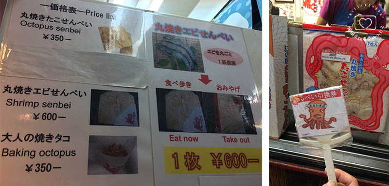 店內的人會先請你點餐並買單,因為他們會現點現作,熱熱的吃才好吃! 買完單就會拿到一個長的很像蒼蠅拍的仙貝兌換券XD