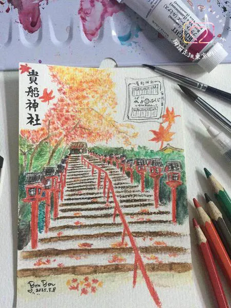 從貴船神社回來後,就一直想著看到過的景色,在腦海中留下深刻的印象,所以親自手繪了一張旅遊明信片當作此次旅程的紀念。