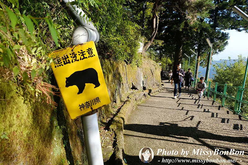 從纜車站需要走一小段通道到神社下方,才走一下就看到”熊出沒注意”的標示,真是嚇死了!! 可是就算熊出沒我也沒地方可逃呀!! 旁邊可是山崖… 突然想到上次去福島走五色沼的恐怖回憶,一路上都有”熊出沒注意”的標示,然後天色又快黑了,又快下大雨了,讓我們這群人是用快步走完全程,汗流滿身,只差沒用跑的,完全沒在欣賞沿路風景的。