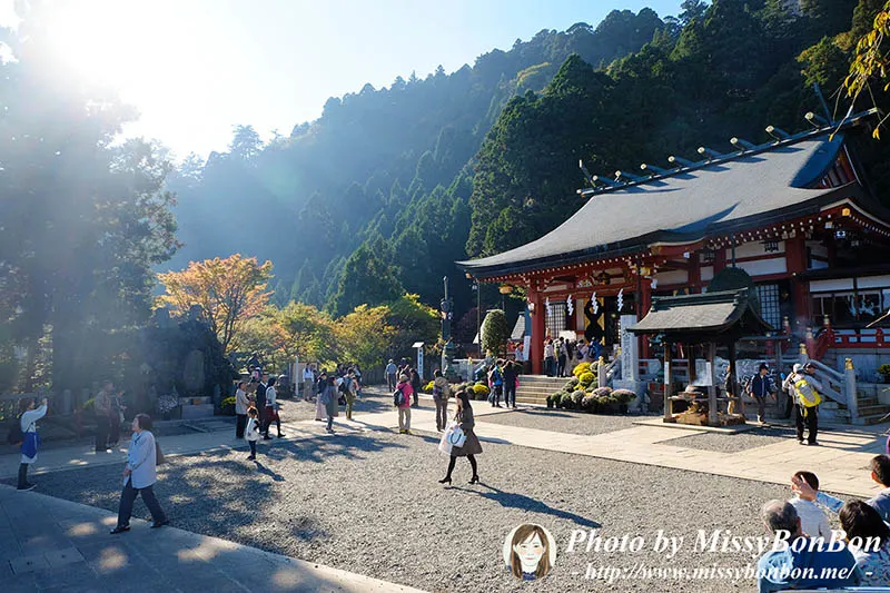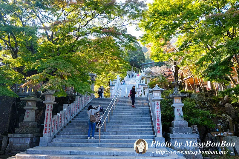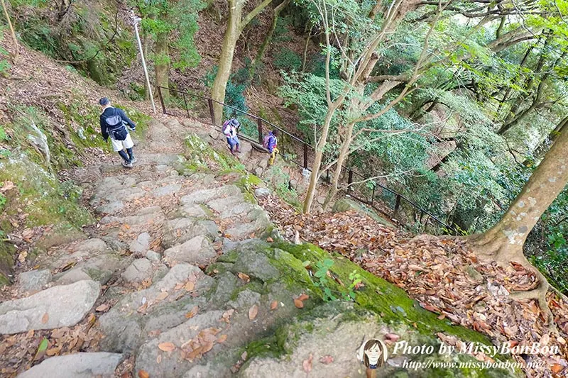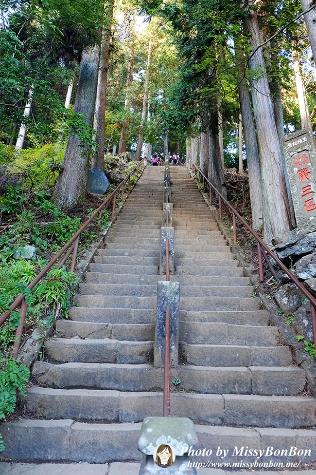 因為我們都沒有想到山路竟然如此陡峭…階梯的落差蠻高的,而且不像那種風景區的登山步道修建的很好,這裡根本是半原生狀態,石塊、樹幹、樹根….走到我一定要扶著手扶或是山壁旁的鐵鏈…腿整個都在發抖,最後差點對老公發火為什麼不去坐纜車。女坂都陡成這樣了,那男坂還得了! 邊走邊想著古人真是太厲害了要走這麼陡的山路來參拜,我真是廢人一枚…