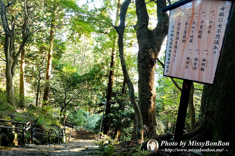 不想往上爬,老公說那我們試著走一段下坡的山路好了當作健身。於是我們選了女坂 (下山的路有分男坂和女坂,大約只差5分鐘路程),從大山阿夫利神社下社走女坂的山路到達雨降山大山寺,大約需要花20分鐘,而且聽說女坂的坡度較緩。女坂的路上有七個景觀可以欣賞,但是…我一個都沒注意到…為什麼呢?