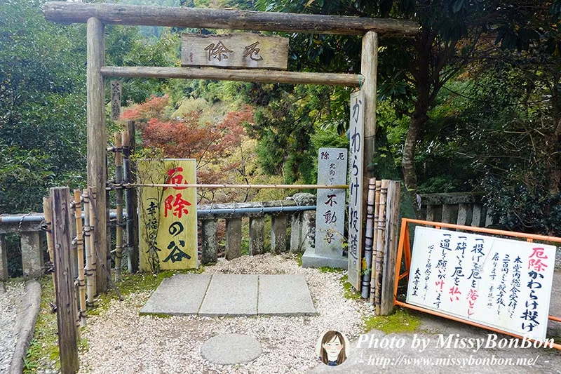 此外,寺內還提供「厄除陶土皿」,這個白色的像小碟子(大約5公分左右吧)寫上願望後往山谷一丟,象徵把災厄拋下。看到山谷裡滿是碎片,不禁覺得,原來大家都和我一樣,有些煩惱需要卸下。三百日元可以購買到二碟陶土皿。