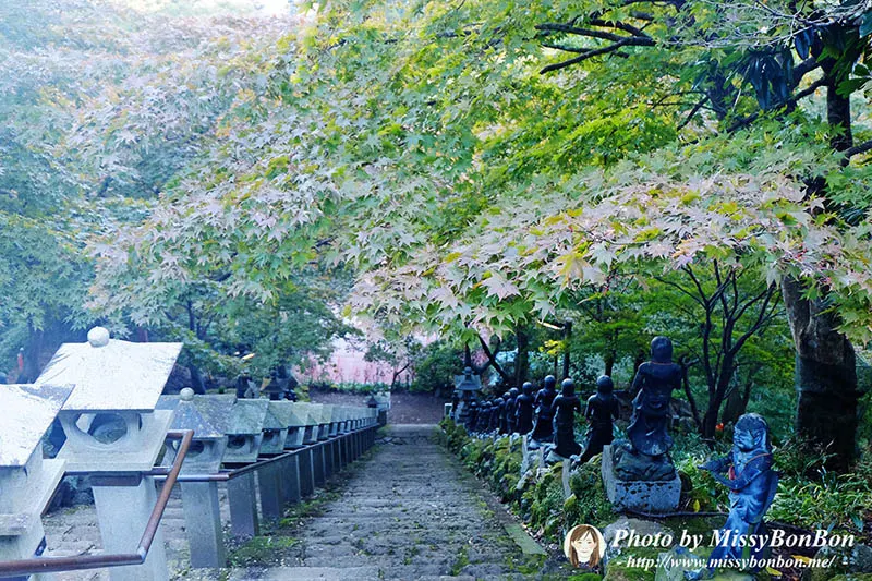 這間寺院位處於深山中,比較幽靜,全木造的建築看得出歲月所留下的痕跡,不像上面的阿夫利神社香火這麼鼎盛,裝修維護的比較完善。是賞楓迷私藏的祕密景點。參道兩旁羅漢像與楓樹並列,聽說紅葉季時美得像一幅畫。雖然我們早到了點,只看到滿山綠意,但也能想像那層層紅葉下的靜謐與莊嚴。