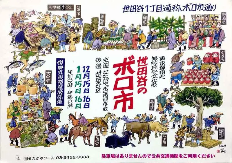「世田谷舊物市集」是東京歷史最悠久的傳統年市之一,至今已有超過400年的歷史。與台灣的年貨市集不同,這個市集以二手物品和懷舊商品為主,尤其當地農民會在這裡出售家中的二手衣物、古董、生活用品及手工藝品。市集中的「ボロ」(BORO)一詞源自於日本的傳統麻布拼布工藝,這些舊布片被巧妙地拼湊並經過染色,最終轉變成為日常家用的布品或衣物。