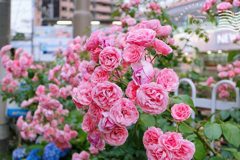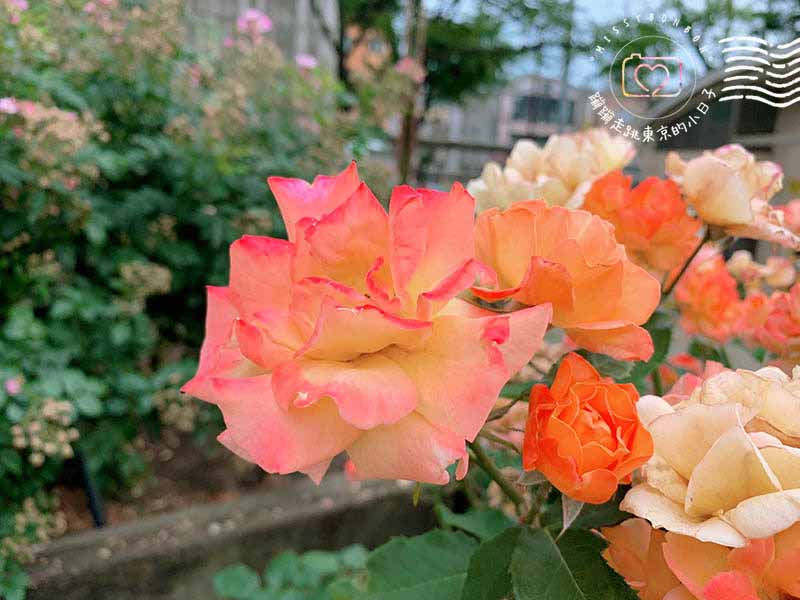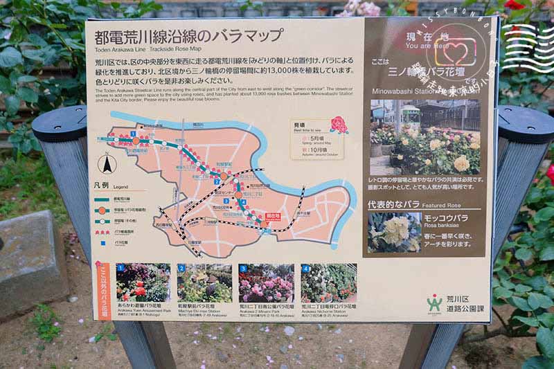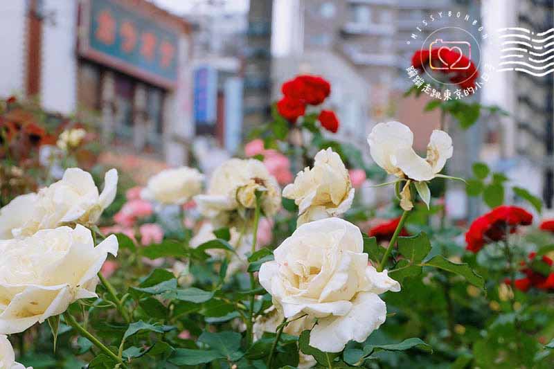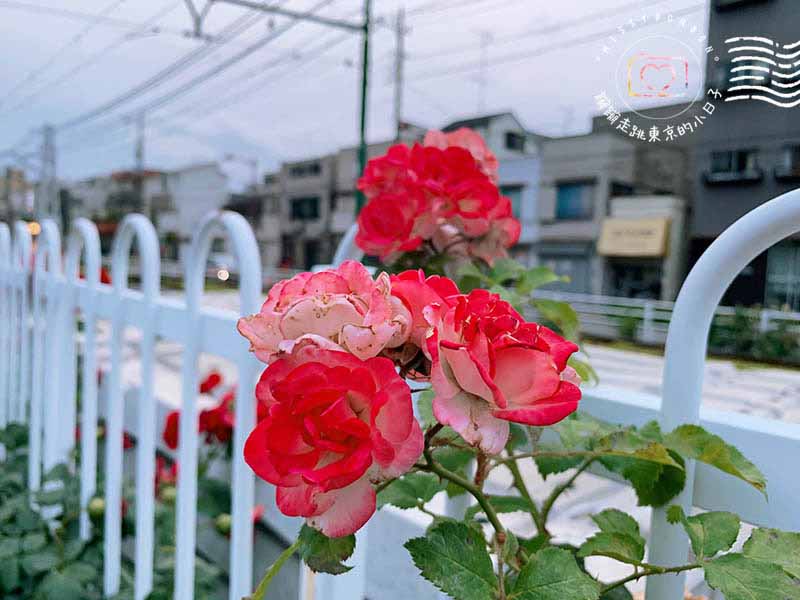 從荒川遊園地前一路步行至荒川車庫前站,沿途都是玫瑰大道,雖然這天是陰天,晴空塔也藏在雲霧中,但反而多了一份朦朧美。不過要提醒的是賞花之餘也要小心往來的行車,注意自身安全!