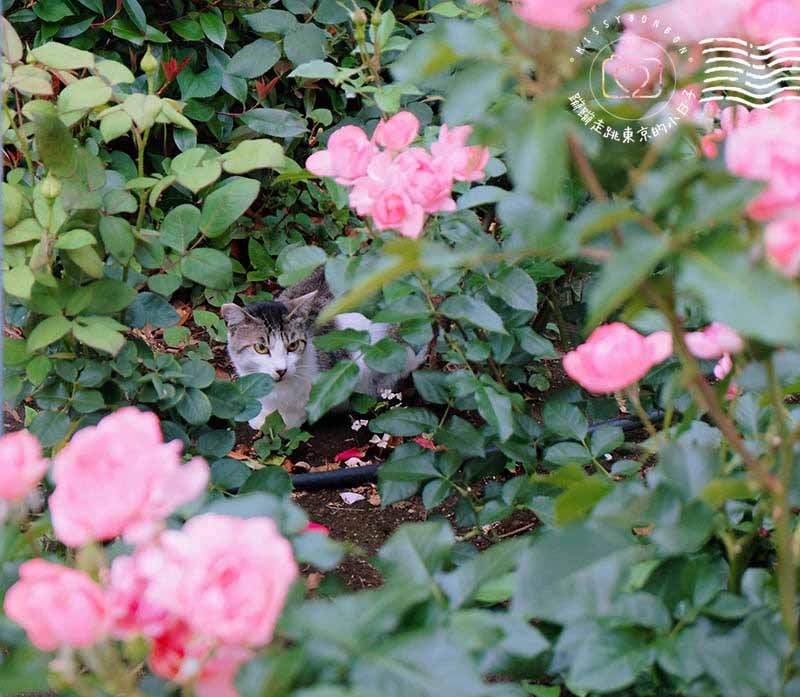 這一站除了有正在整修的荒川遊樂園外,附近的公園也種滿玫瑰,是個適合散步、野餐、拍照的好地方。拍花時突然聽到喵叫聲,抬頭一看,竟然有隻貓咪藏身花叢中,可愛度爆表!