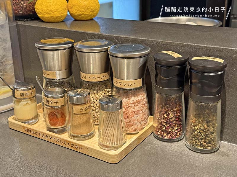 在等候餐點的時候,看了一下桌上擺放著許多調味料:岩鹽、辣椒粉、花椒、五香粉、蒜、黑胡椒粉、白胡椒粉等。不過我都沒有用到,因為我點的餐點味道已經足夠。