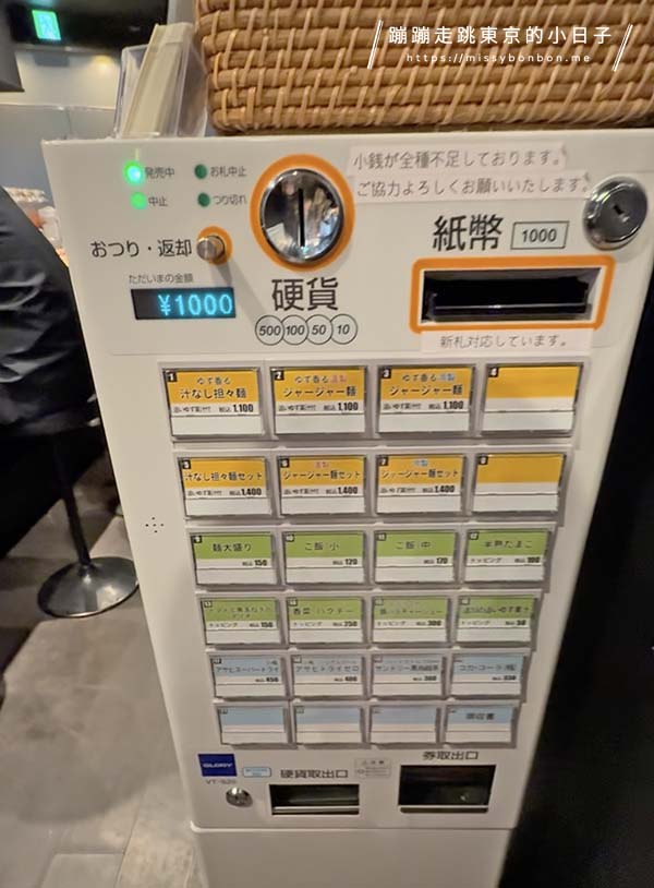進店後,首先需要在自動販賣機購買食券,選擇自己想要的品項。除了店內的二道招牌「柚子香氣無湯擔擔麵」和「柚子香氣無湯炸醬麵」之外,也可以選擇這二道招麵的套餐形式,就是有附半份叉燒飯。