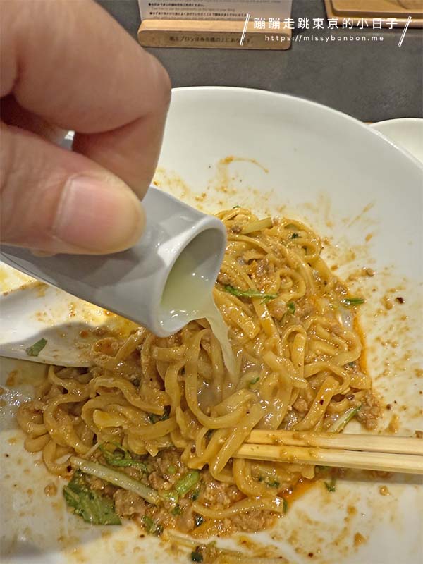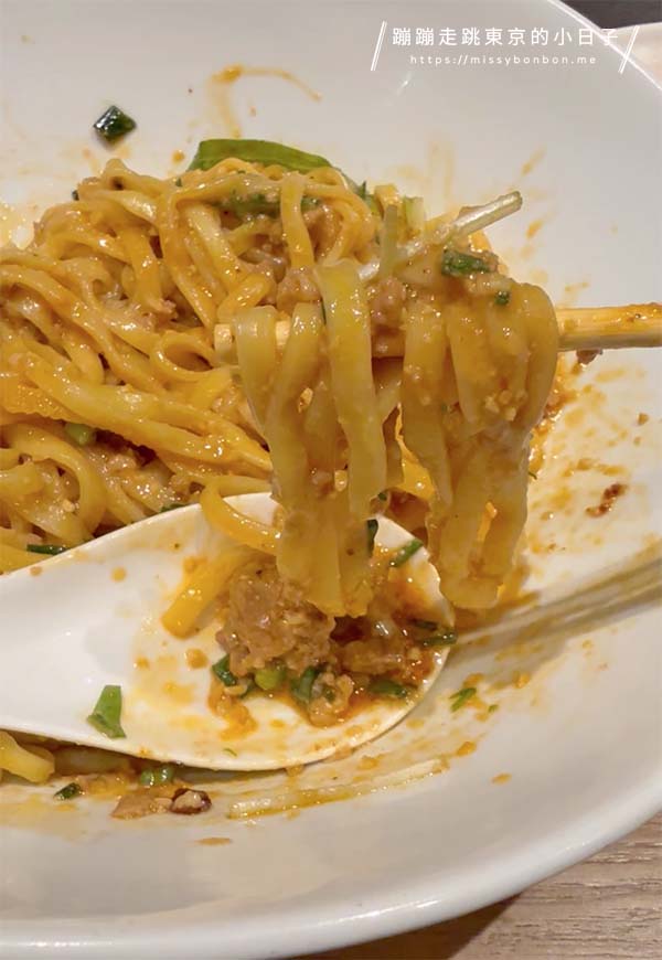 雖然是無湯擔擔麵,但湯汁的份量其實不少,因此品嘗前請先充分攪拌,讓湯汁與麵條乳化,味道更加融合。讓整體口感更具濕潤感。