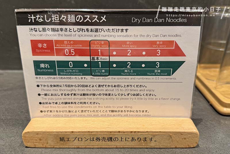當購買完食券,且店員領你入座之後,如果你是點「柚子香氣無湯擔擔麵」的話,店員會問你喜好的辣度(0.5~3級)以及麻度(0~3級),可以參考桌上的立牌說明。標準為「辣度1、麻度1」。因為我不熟悉這間店的辣度,所以這次先保守的選擇了「辣度1、麻度1」。